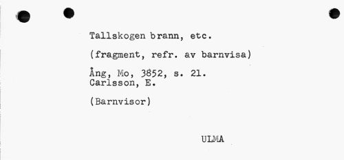 //// Tallskogen brann, etc. //// (fragment, refr. av barnvisa) //// Äng, Mo, 3Ö52, s. 21. Carlsson, E. //// (Barnvisor) //// ULMA ////