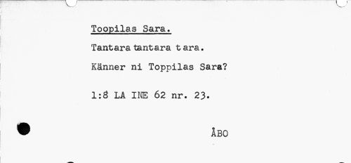 //// Toopilas Sara. //// Tantara tantara tara. //// Känner ni Toppilas Sara? //// 1:0 LA INE 62 nr. 23. ////