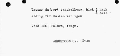 //// Tappar du b ort skackelkepa, hick å hack //// å hack • //// aldrig får du den mer igen Vsld 120, Polska, fragm. //// ANDERSSON SV. LÅTAR ////