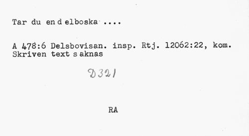 //// Tar du en d elboska* //// A 470:6 Delsbovisan. insp. Rtj. 12062:22, kom. Skriven text s aknas //// <1)31) //// RÅ ////