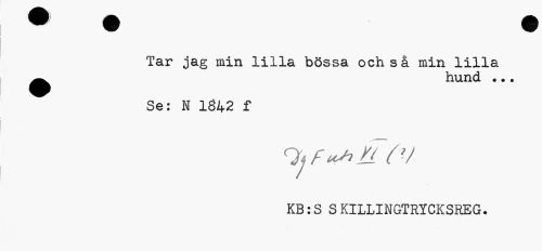 //// Tar jag min lilla bössa och så min lilla ^^ hund ... //// Se: N 1842 f //// ^fusiå Yv //// KB:S SKILLINGTRYCKSREG. ////