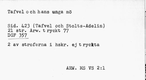 //// Tafvel och hans ranga mö //// Sid. 423 (Tafvel och Stolts-Ådelin) 21 str. årw. t ryckt 77 //// DGF 357 //// w>l //// 2 av stroferna i hskr. ej t ryckta //// ARW. MS VS 2:1 //// ¦ //// • j — //// I ////