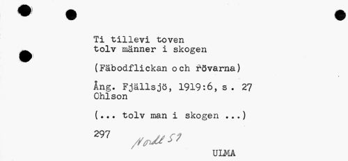 //// Ti tillevi toven ^ tolv männer i skogen //// (Fäbodflickan och rövarna) //// Ang. Fjällsjö, 1919:6, s. 27 Ohlson //// (... tolv man i skogen ...) //// 297 s^v //// ULMA ////