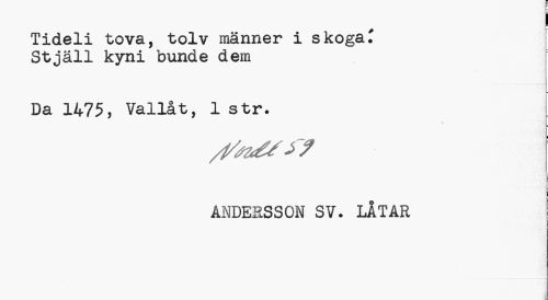 //// Tideli tova, tolv männer i skoga? Stjall kyni bunde dem //// Da 1475, Vallåt, 1 str. //// /t/szé/y? //// ÄNDESSSON SV. LÅTAR //// - ////