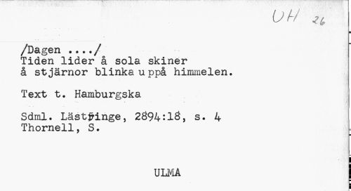//// UN H //// /Dagen .../ //// Tiden lider å sola skiner å stjärnor blinka uppå himmelen. //// Text t. Hamburgska //// Sdml. Lästfringe, 2Ö94:1Ö, s. 4 //// Thornell, S. . //// ULMA | ////