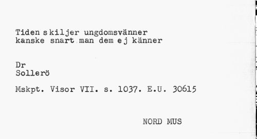 //// r //// Tiden skiljer ungdomsvänner kanske snart,man dem ej känner //// Dr ; //// Sollerö //// Mskpt. Visor VII. s. 1037. E.U. 30615 j //// NORD MUS ////