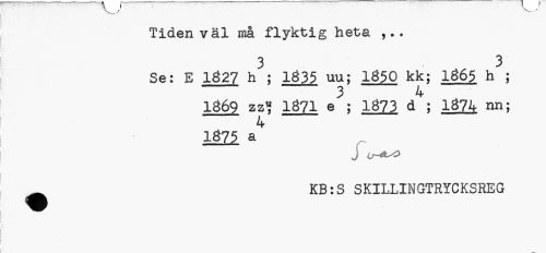 //// -w jS¦ "V,../ //// Tiden väl må flyktig heta //// 3 , 3 //// Se: E 1327 h ; 1335 uu; 1350 kk; 1365 h ; //// 3 4 //// 1369 zz« 1371 e ; 1373 d ; 1374 nn; //// 4 //// 1375 a //// J //// ^ KB:S SKILLINGTRYCKSREG ////
