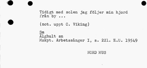 //// Tidigt med solen jag följer min hjord från by ?.? //// 9 (not. uppt C. Viking) //// Sm //// Alghult sn //// Mskpt. Arbetssånger I, s. 221. E.U. 19549 //// NORD MUS ////