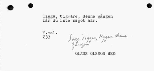 //// Tigga, tiggare, denna gången får du inte något här. //// M.mel. å * //// OLAUS OLSSON REG ////