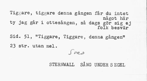//// Tiggare, tiggare denna gången får du intet //// något här //// ty jaS går i ottesången, så dags gör sig ej //// folk besvär //// Sid. 51, "Tiggare, Tiggare, denna gången" //// 23 str. utan mel. //// STERNWALL SÅNG UNDERSEGEL ////