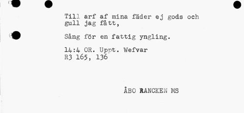 //// Till arf af mina fäder ej gods och gull jag fått, //// Sång för en fattig yngling. //// 14:4 OR. Upr>t. Wefvar R3 165, 136 //// ÅBO RÅNCKEN MS //// f ////