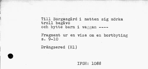 //// Till Borgasgård i natten sig mörka troll begåvo //// och bytte barn i vaggan --- //// t //// Fragment ur en visa om en bortbyting s. 9-10 //// Drängsered (Hl) //// IFGH: 10SÖ ////