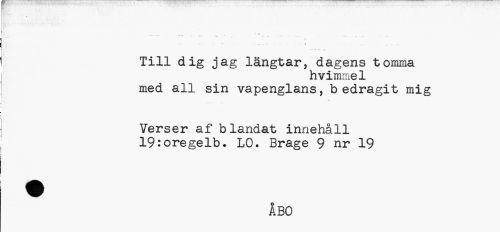 //// Till dig jag längtar, dagens tomma //// hvimmel //// med all sin vapenglans, bedragit mig //// -v //// Verser af blandat innehåll 19:oregelb. LO, Brage 9 nr 19 //// åbo ////