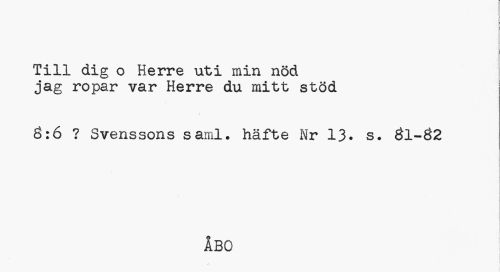 //// f //// c //// Till dig o Herre uti min nöd jag ropar var Herre du mitt stöd //// 8:6 ? Svenssons saml. häfte Nr 13* s. $1-82 //// ÅBO ////