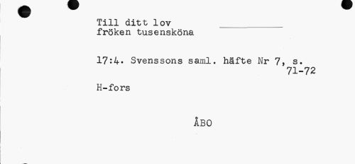 //// Till ditt lov ___ ___ //// fröken tusensköna //// 17:4» Svenssons saml. häfte Nr 7, s. //// 71-72 //// H-fors //// ÅBO ////