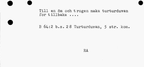 //// Till en öm och t rogen maka turturduvan for t illbaka .. .. //// ^ B 64:2 b.s. 2S Turturduvan, 5 str. kom. //// RA ////