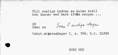 //// * • . . ... //// Till ensliga hyddan en kulen kväll kom Gunnar med bark ifrån skogen ..? //// Ösmo sn S^ * //// Mskpt.Arfeetssånger I, s. 769. E.U. 21Ö99 //// NORD MUS ////