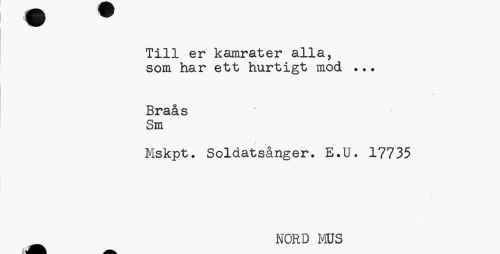 //// Till er kamrater alla, som har ett hurtigt mod ... //// Braå s //// Sm //// Mskpt. Soldatsånger. E.U. 17735 //// NORD MS ////