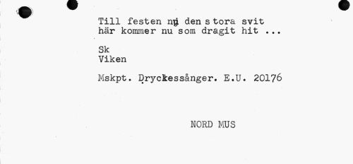//// Till festen den s tora svit här kominer nu som dragit hit ... //// Sk //// Viken //// Mskpt. Dryckessånger. E.U. 20176 //// NORD MOS ////