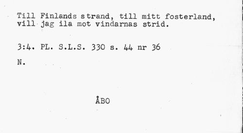//// f //// Till Finlands strand, till mitt fosterland, vill-jag ila mot vindarnas strid. I //// 3:4. PL. S.L.S. 330 s. 44 nr 36 N. //// ÅBO I //// j //// t //// I ////