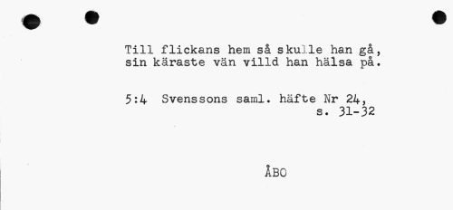 //// Till flickans hem så skulle han gå, sin käraste vän villd han hälsa på. //// 5:4 Svenssons saml. häfte Nr 24, //// s. 31-32 //// / //// ÅBO ////