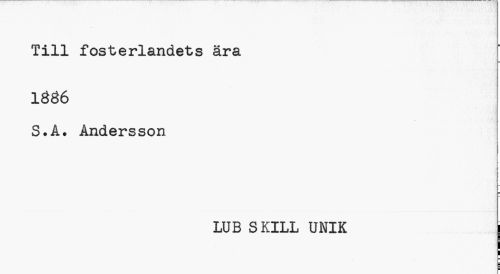 //// Till fosterlandets ära 1886 //// S. A. Andersson //// i //// •I //// i //// > //// LUB SKILL UNIK j ////