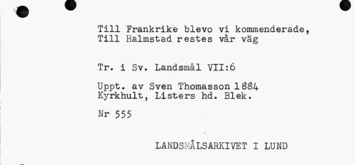 //// Till Frankrike blevo vi kommenderade, Till Halmstad restes vår väg //// Tr. i Sv. Landsmål VII:6 //// Uppt. av Sven Thomasson 1ÖÖ4 Kyrkhult, Listers hd. Blek. //// Nr 555 //// LANDSMÅLSARKIVET I LUND ////