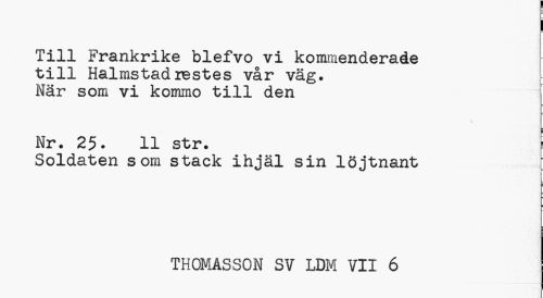 //// I //// Till Frankrike blefvo vi kommenderade //// till Halmstad restes vår väg. : //// När som vi kommo till den //// i //// m //// Nr. 25. 11 str. //// Soldaten som stack ihjäl sin löjtnant //// THOMASSON SV LDM VII 6 ////