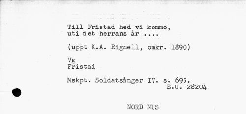 //// f //// ...- v • - •¦ W ...v . . ...K //// Till Fristad hed vi kommo, uti d et herrans år ... //// (uppt K.A. Rignell, orakr. 1390) //// 7g //// Fristad //// Mskpt. Soldatsånger IV. s. 695. //// ^ E.U. 2Ö204 //// NORD MUS ////