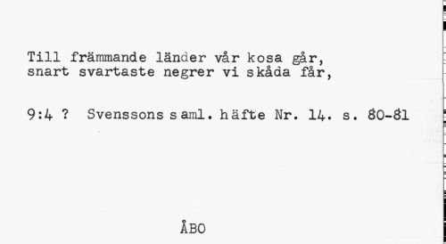 //// i //// Till främmande länder vår kosa går, snart svartaste negrer vi skåda får, //// 9:4 ? Svenssons saml. häfte Nr. 14. s. 30-31 ; //// ÅBO j ////