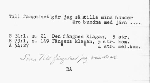 //// Till fängelset går jag så stilla mina händer //// äro bundna med järn ... //// B 31:1. s. 21 Den fångnes Klagan, 5 str. B 73:1, s. 149 Fångens klagan, 5 str. kom. Å 54:27 »t M 4 str. mel.kom. //// RA ////