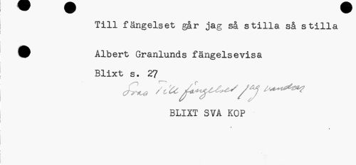 //// Till fängelset går jag så stilla så stilla //// W Albert Granlunds fängelsevisa //// Blixt s. 27 //// BLIXT SVA KOP //// t //// * ////