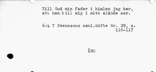 //// Till Gud min fader i himlen jag ber, //// att han till mig i mitt elände ser. //// / //// 6:1+ ? Svenssons saml.häfte Nr. 29, s. //// 116-117 //// \ //// ÅBO ////