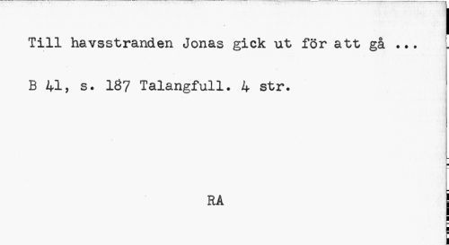 //// Till havsstranden Jonas gick ut för att gå ... B 41, s. 187 Talangfull. 4 str. //// ¦ //// RA I ////