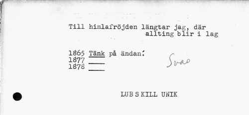 //// ft //// Till himlafröjden längtar jag, där //// allting blir i lag //// r» • //// 1865 Tänk på ändan' //// 1Ö77 __\ )H*J> //// 1070 m ^ 6 //// 0 LUBSKILL UNIK ////