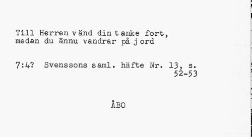 //// c r //// ! //// Till Herren vänd din t anke fort, medan du ännu vandrar på j ord //// ¦ //// 7:4? Svenssons saml. häfte Nr. 13, s. //// 52-53 //// i //// ÅBO //// ¦ ////