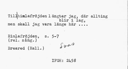 //// Tiljjhimlafröjden 1 ängtar jag, där allting //// blir i lag, men skall jag vara länge här •.•. //// Himlafröjden, s. 5-7 //// (rel. sång.) Breared (Hall.) //// ' I //// : 1 //// IFGH: 2458 ////