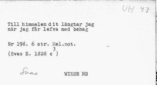 //// VliHi. //// Till himmelen dit längtar jag när jag får lefva med behag //// Nr 198. 6 str. Mel.not. //// 3 //// (Svas E. 1828 c ) //// WIEDE MS ////