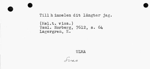 //// Till h immelen dit längtar jag. //// (Mel.t. visa.) //// Vsml. Norberg, 7612, s. 64 //// Lagergren, E. //// ULMÅ ////