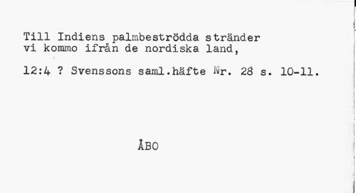 //// Till Indiens palmbeströdda stränder //// vi komrno ifrån de nordiska land, //// i //// 12:4 ? Svenssons saml.häfte Nr. 20 s. 10-11. //// I //// i //// f t //// ÅBO ; //// | //// I //// ¦ //// ! ////
