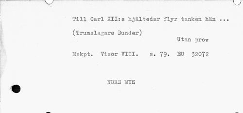//// Till Carl XII:a hjältedar flyr tanken hän ... (Trumslagare Dunder) //// Utan prov //// Mskpt. Yisor VIII. s. 79* EU 32072 //// HORD MUS ////