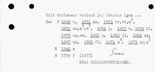 //// Till kärlekens hemland jag längtar igen ... //// 3 //// Se; S 1846 a, 1851 xx, 135,5 Fr,tt,m , ® 1855 nu.e^m^, 1856 .1, 1857 ht 1858 11, //// 1859 qq,ss, 1860 q, 1862 jj, I864 qq, //// 1867 qq, 1868 ff, 1QJ1 c4, IQJ^ gg, z^ N 1846 m /-- //// s 1759 f (1877) J l^o //// KB:S SKILLINGTRYCKSREG. ////