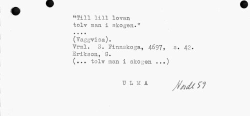 //// ^^ "Till lill lovan //// tolv man i skogen." % t • • //// (Vaggvisa). //// Vrml* 8. Finnskoga, 4^97 > s. 42. Erikson, G. //// (... tolv man i skogen ..?) //// ULMA /A/tn ////