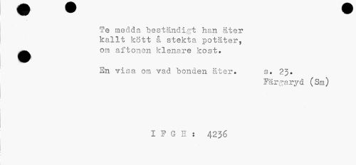 //// Te medda beständigt han äter kallt kött å stekta potäter, ^^ om aftonen klenare kost» //// Sn visa om vad bonden äter. s. 23. //// Färg-aryd (Sm) //// I P G H : 4236 ////
