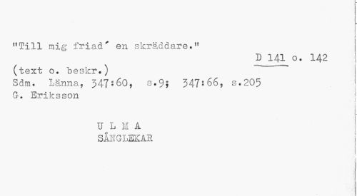//// > //// "Till mig friad' en skräddare." //// D 141 o. 142 //// (text o. beskr.) //// Sdm. Länna, 347*60, s.9; 347166, s.205 //// G-. Eriksson j //// TT L M Å SÅIIGLEKÅR ////