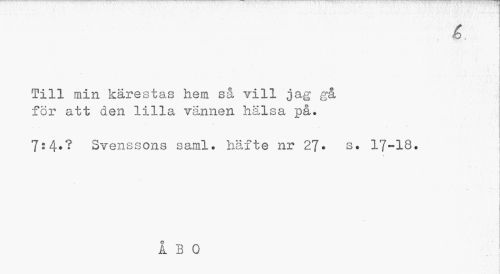 //// f //// . . . //// j //// Till min kärestas hem så vill jag gå för 11 den vännen hälsa pä. //// 7:4.? Svenssons saml. häfte nr 27* 3. 17-18. //// I BO ////