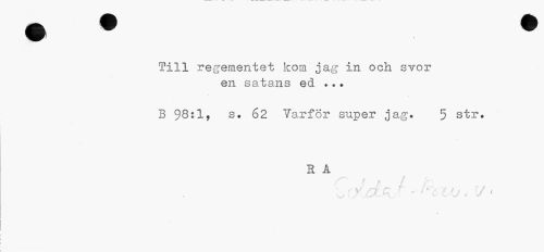 //// I //// Till regementet kom jag in och svor //// en satans ed //// B 98:1, s. 62 Varför super jag» 5 str. //// R A //// ? * f //// i' %J f*' T" . ' ;• t t rf , //// O ') .£j- H * ' c v t J ' //// ¦ ////