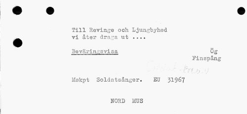 //// Till Revinge och Ljungbyhed //// • vi åter dra/ra ut ... //// Beväringsvisa ög //// ...mm *m#mmMiM*mmimim mmrnmmmmmim ^^ //// Finspång //// - ' : , \j //// Hskpt Soldatsånger. EU 51967 //// NORD MUS ////