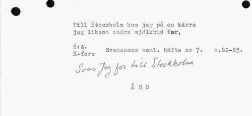 //// Till Stockholm kom jag på en kärra jag liksom andra mjölkbud far, //// é: 4. //// *Z* Svenssons sazal* häfte nr 7* s.82-83• H-iors //// jr uu ^^ //// ÅBO //// } ////