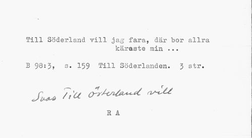 //// Till Söderland vill jag fara, där bor allra //// käraste min ... //// B 98:3, s. 159 Till Söderlanden. 3 str. //// j]^ 7txu a**w^*' //// Rå ////